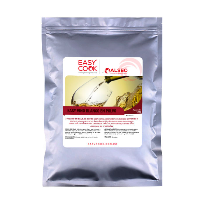 Vino blanco en polvo, se puede usar directamente como sazonador en diversos alimentos o como materia prima en la elaboración de sopas, cremas, queso, sazonadores de carnes rojas, blancas, pescados, adobos, salmueras de inyección, de tombleo, en bases para carnes frías y aderezos de ensaladas.